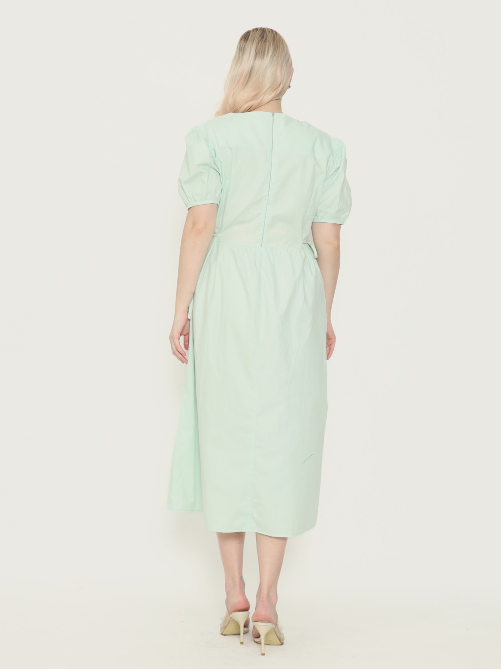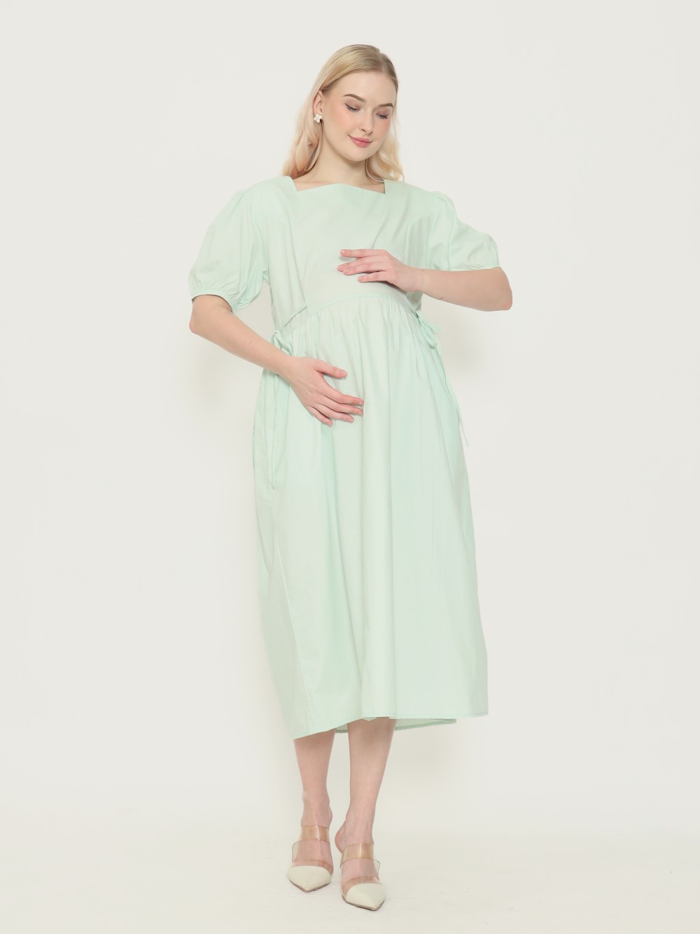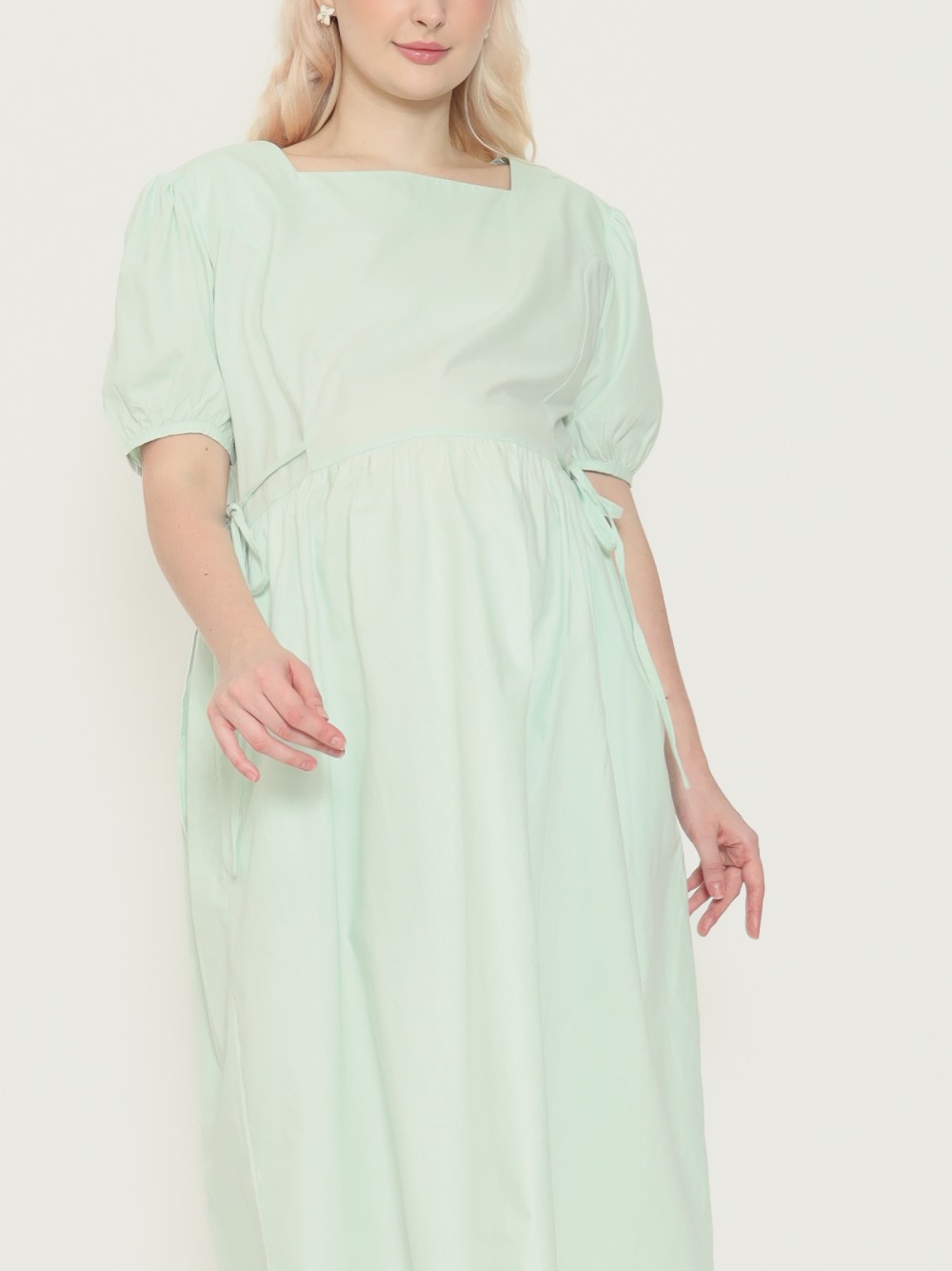 Dress hamil berbahan katun yang adem dan tidak menerawang. Berpotongan babydoll dilengkapi tali di bagian pinggang dan saku samping kanan-kiri. Modelnya manis dengan aksen ruffle di pinggang.