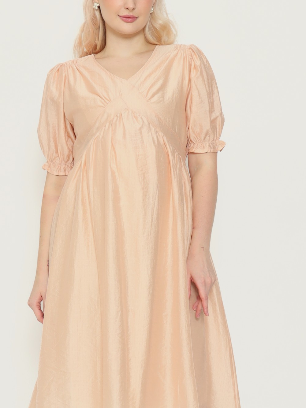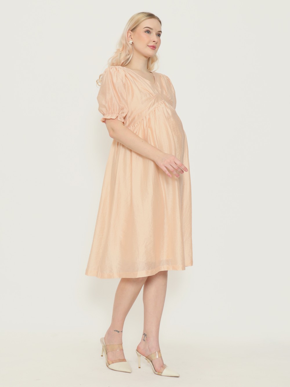Dress hamil berpotongan babydoll dengan model lengan puffy karet yang manis. Berbahan katun yang adem dan ringan, dan dilengkapi furing.