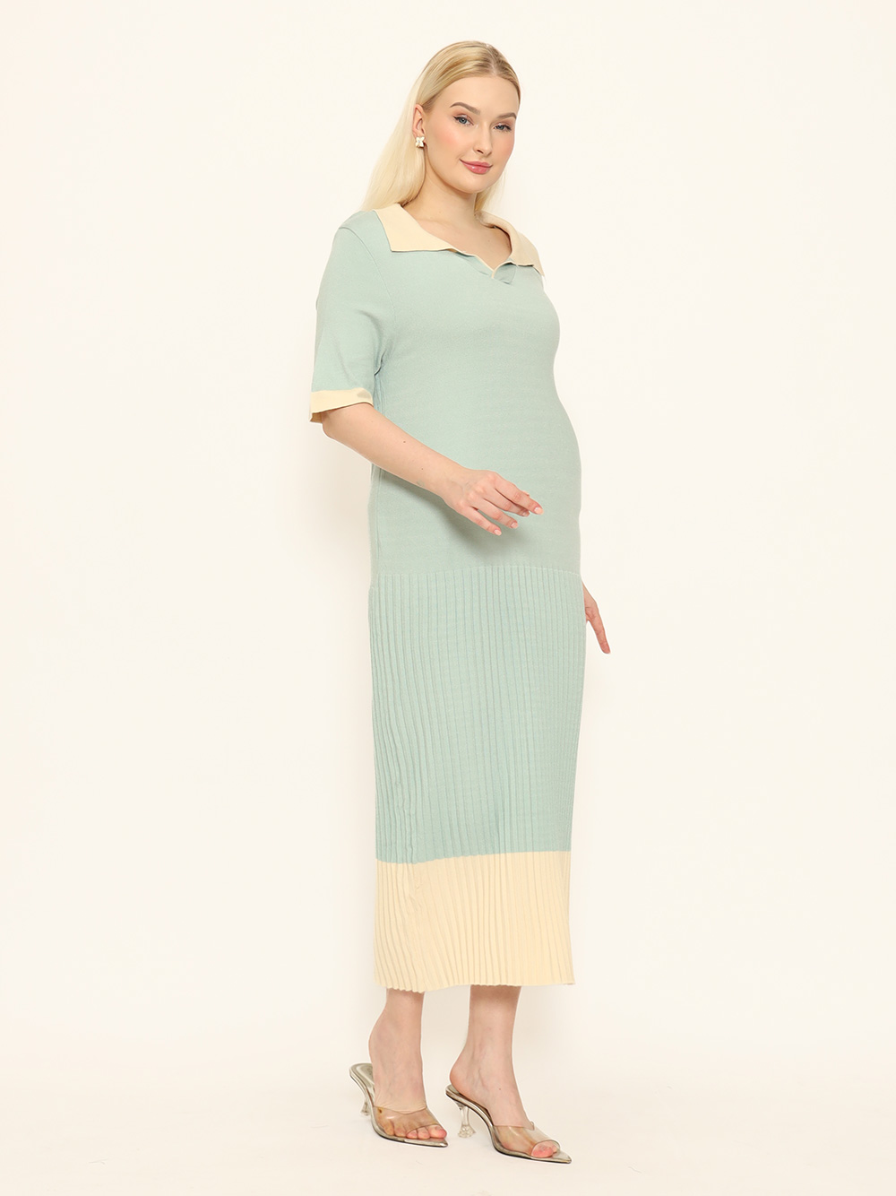 Dress hamil berbahan knit stretch dan soft dengan aksen kerah dan pleats di bagian bawah. Teksturnya halus dan stretch sampai 20cm.